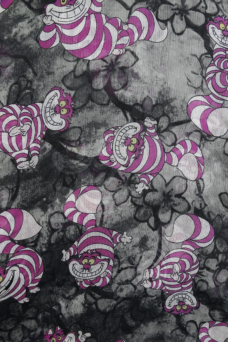 – light scarf with the Cheshire Cat from “Alice in Wonderland” on a grey flower background