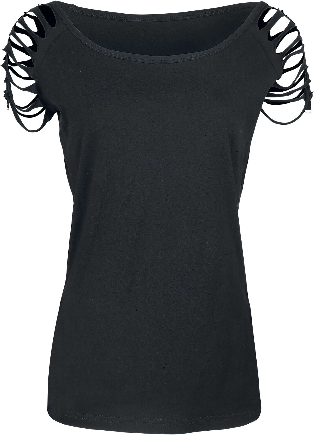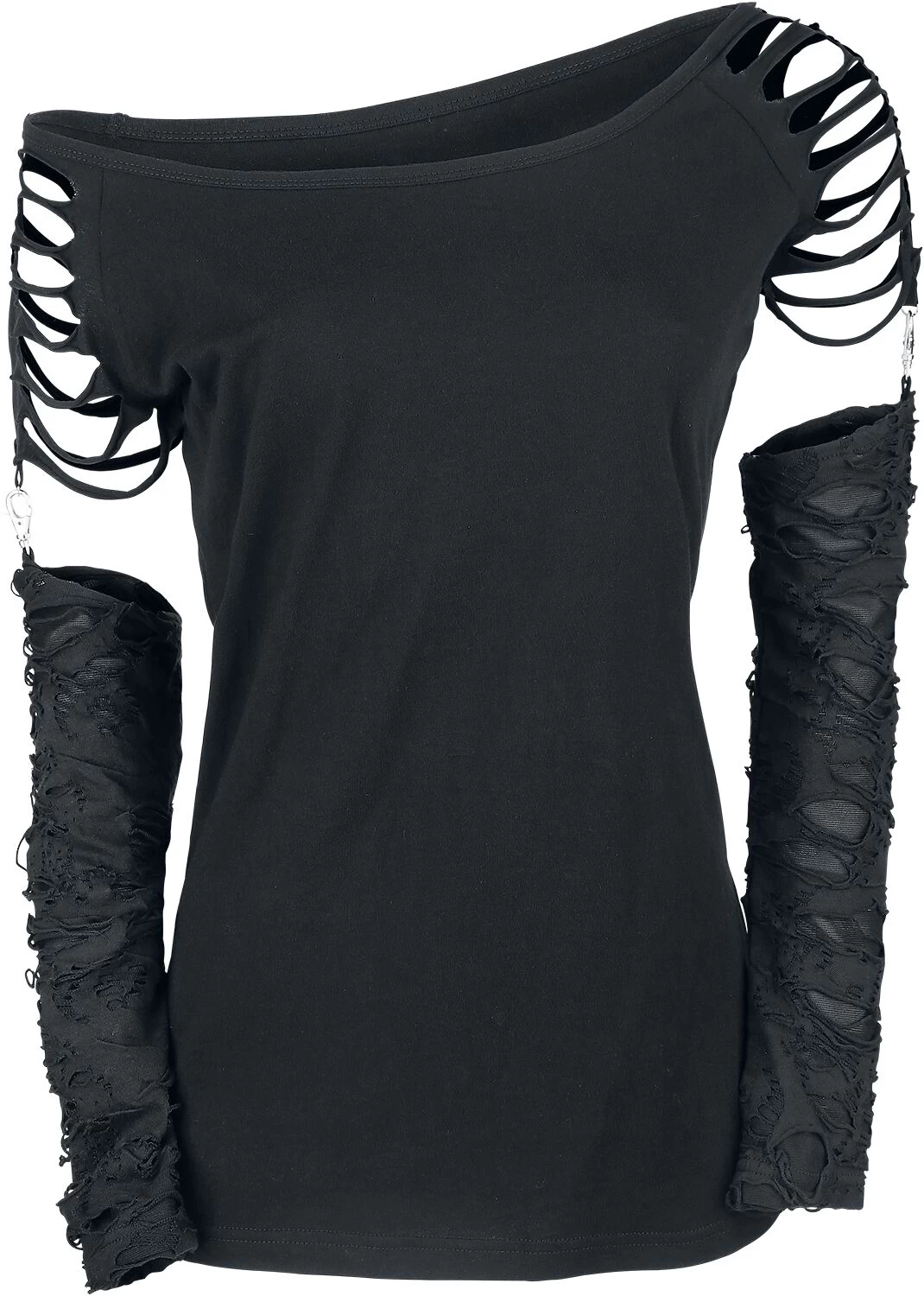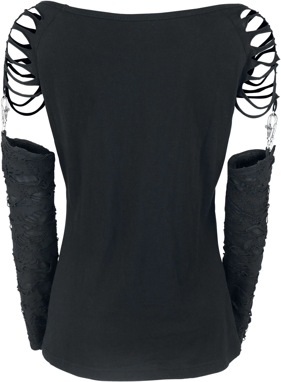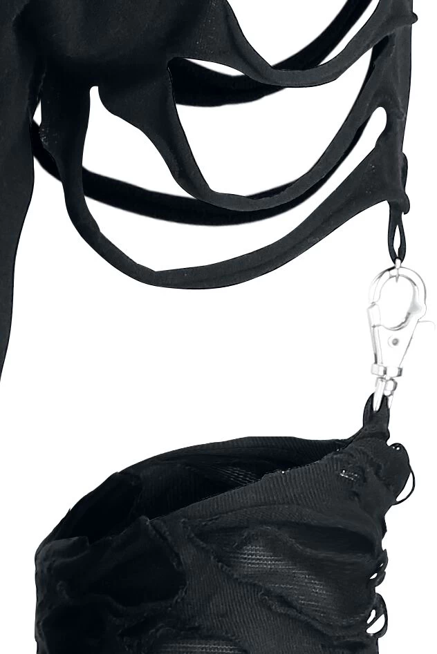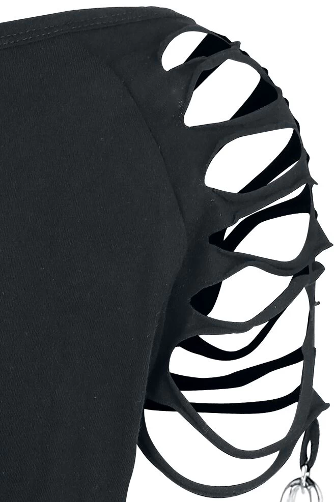 Are you looking for a top with a little extra something? Then cast your eye at this black long sleeve top from Gothicana by EMP. The sleeves hang loose on the silver snap hooks from the slashed shoulders and can be removed. A shirt in keeping with your dark tastes.