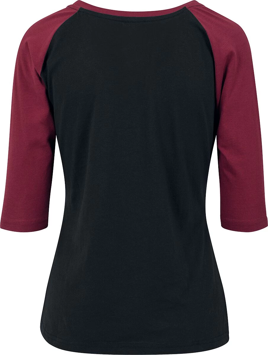 The Ladies 3/4 Contrast Raglan Tee by Urban Classics stands out with a distinctive and trendy contrast design. The shirt has red 3/4 sleeves as well as a red neckline seam, but the torso is kept entirely black.
