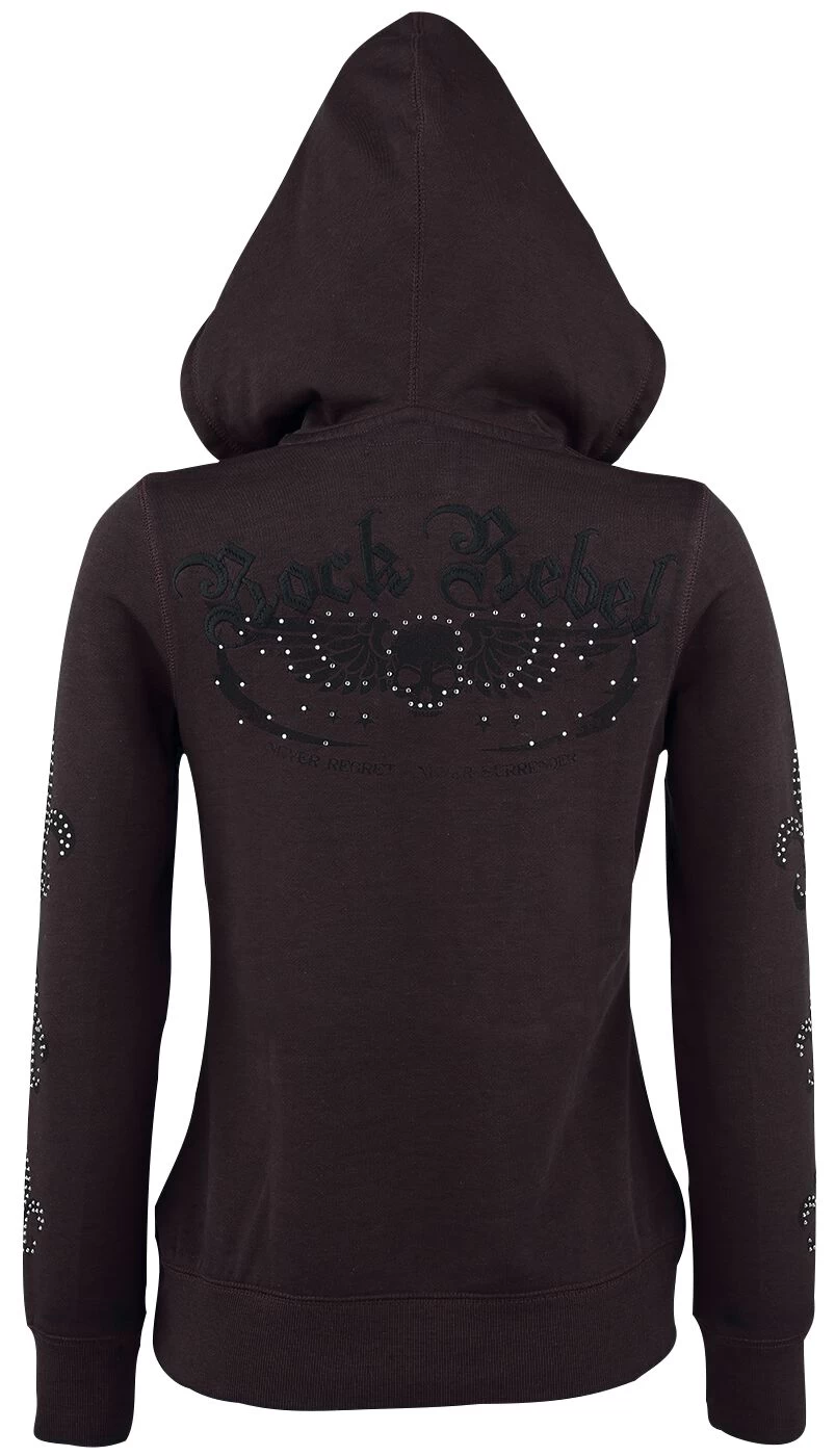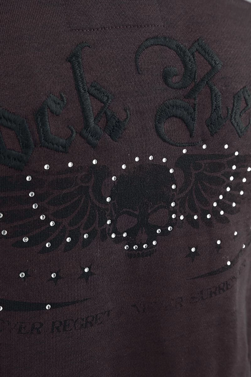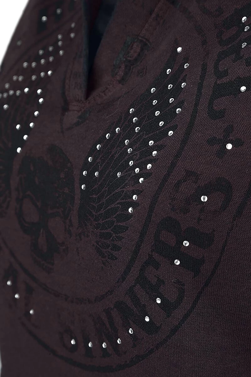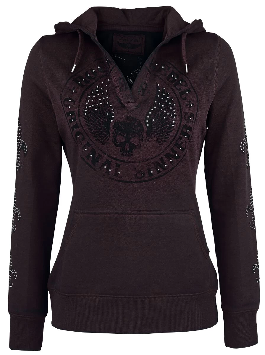V-neck hooded sweater of Rock Rebel. With print on the front, on the sleeves as well as on the back and they’re decorates with rhinestones. The logo on the back is embroidered. The sweater features a kangaroo pocket. The tinged fabric causes the desired vintage effect.