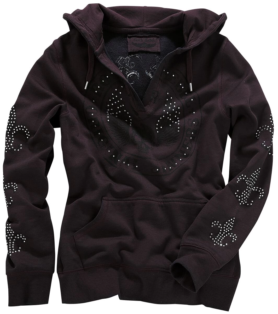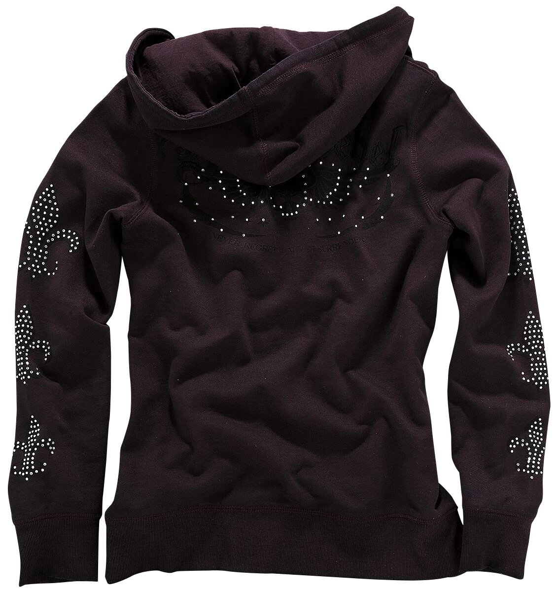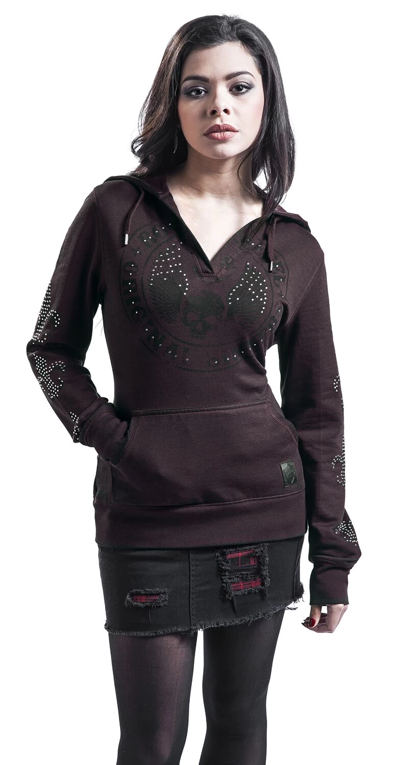 V-neck hooded sweater of Rock Rebel. With print on the front, on the sleeves as well as on the back and they’re decorates with rhinestones. The logo on the back is embroidered. The sweater features a kangaroo pocket. The tinged fabric causes the desired vintage effect.