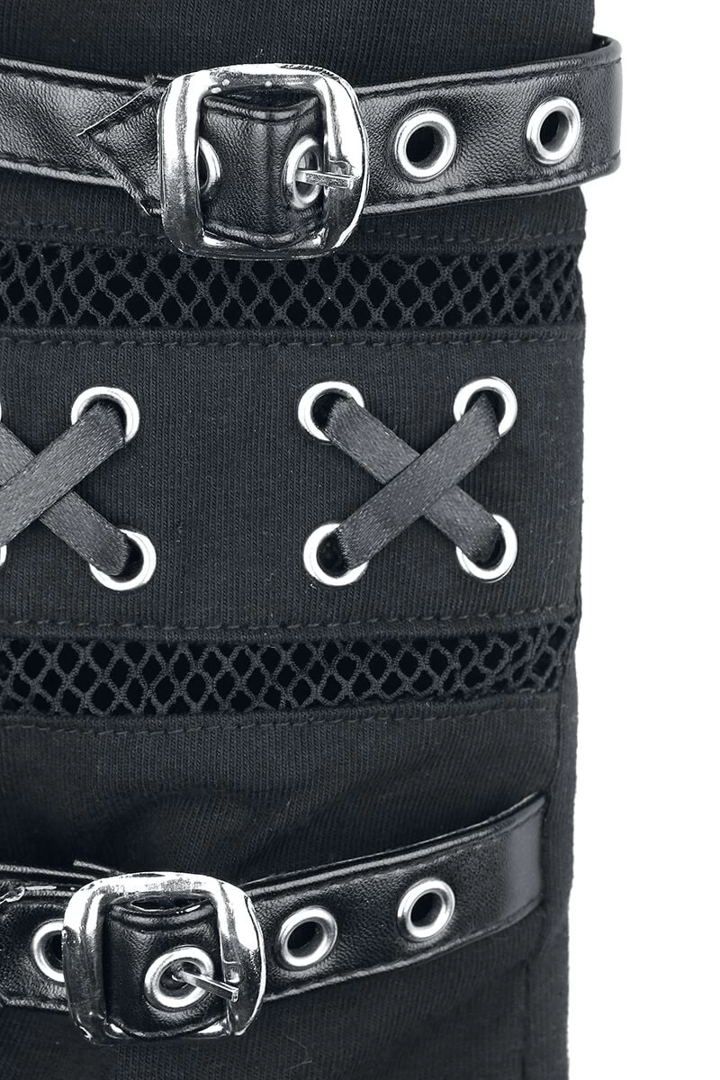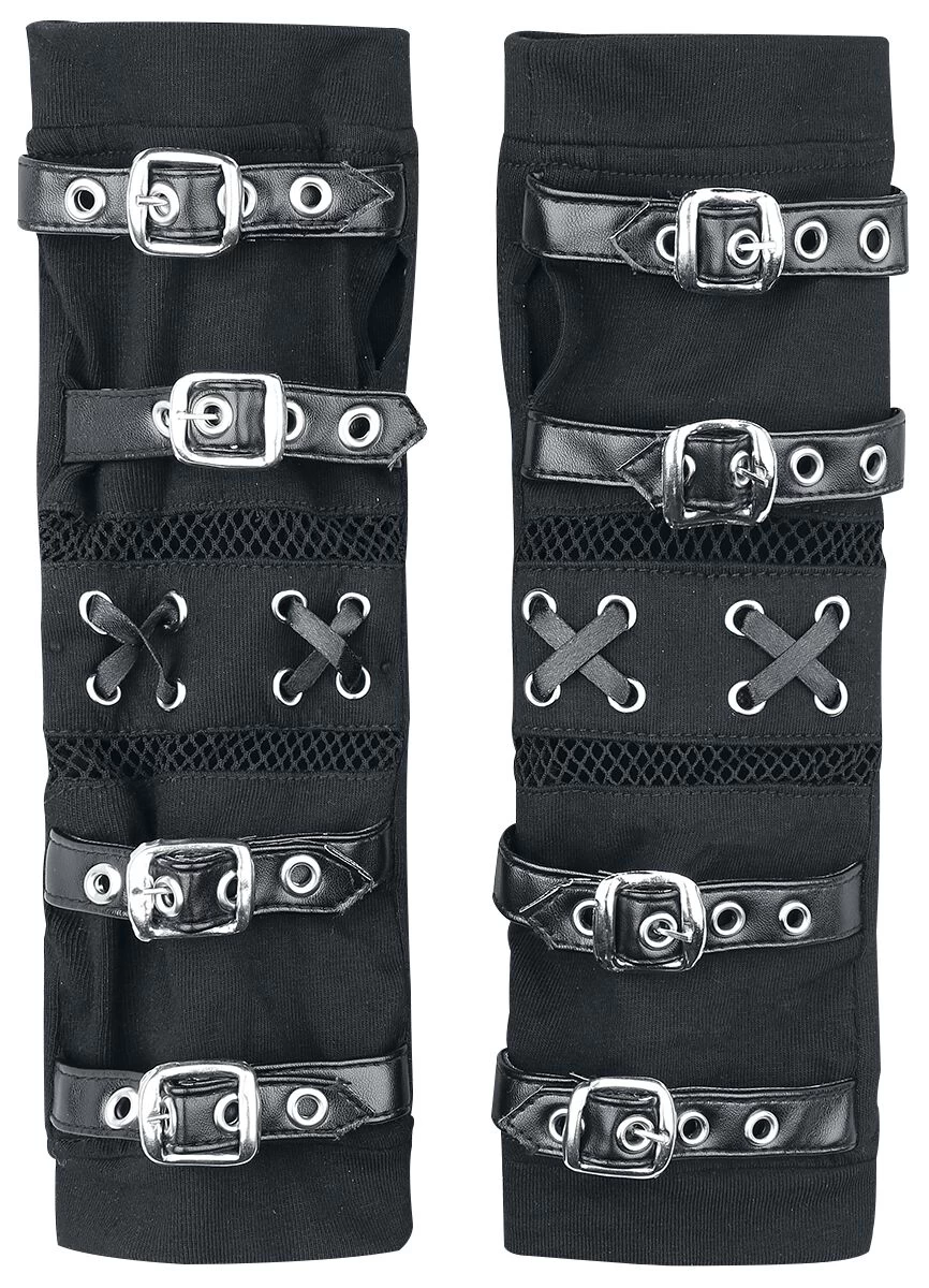 – Black arm warmers with decorative buckles and straps as well as mesh appliqué