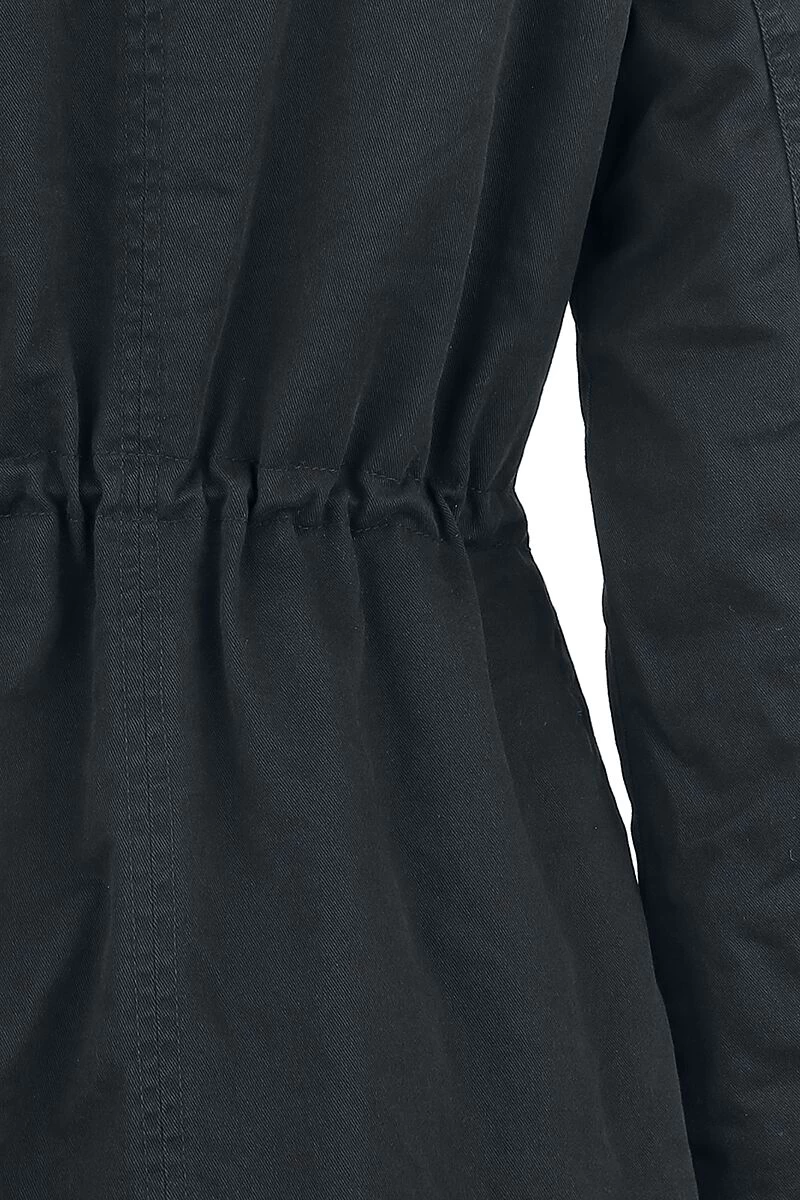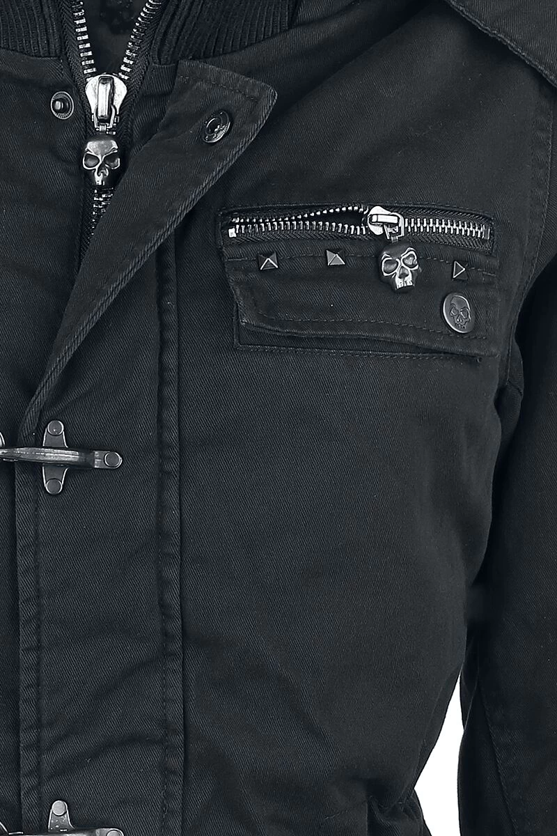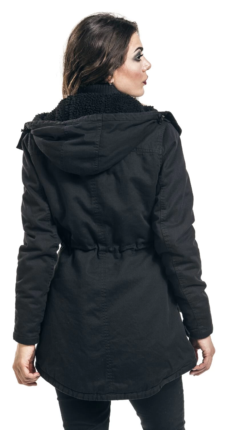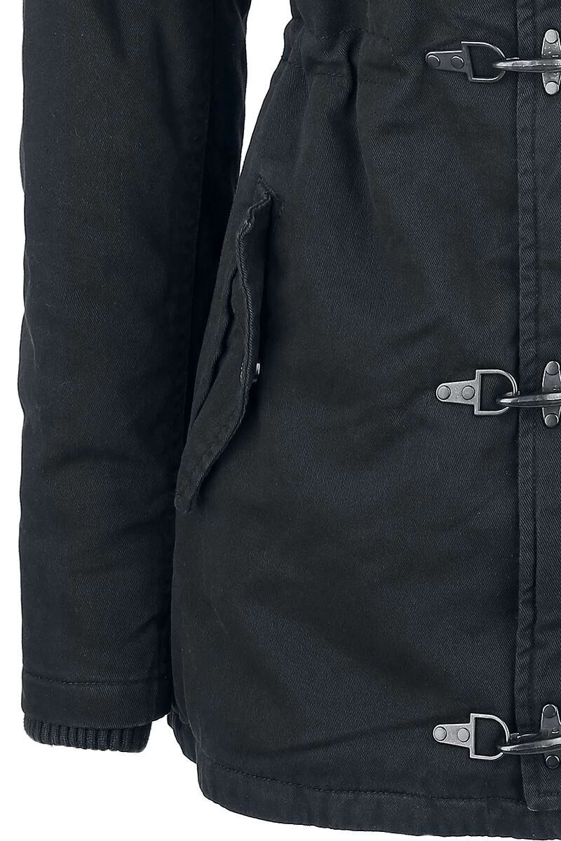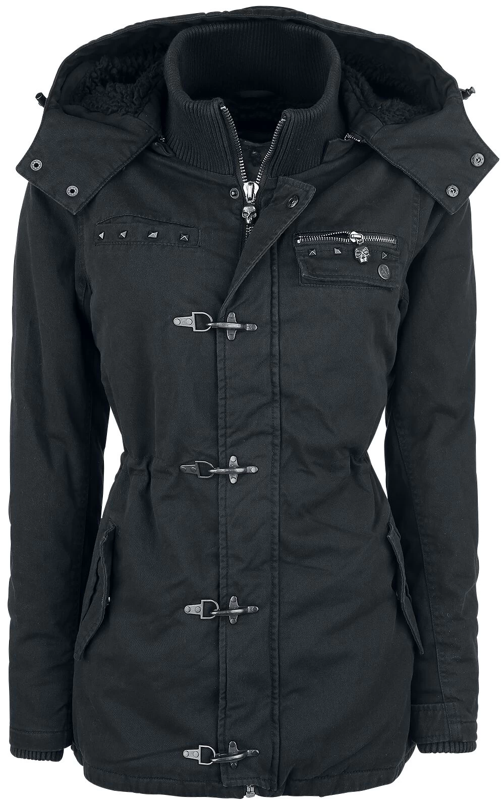Rock Rebel by EMP helps you surviving those cold days of the year with style – and a warm jacket. The black girls jacket is a perfect companion for the winter: the lining and the hood are made of teddy fur, keeping you comfy and warm. Loads of decoration closures and studs on the pockets turn the jacket into just the perfect piece. The hood can be removed – very practical, isn’t it? The waist width can be adjusted by a drawstring casing.